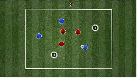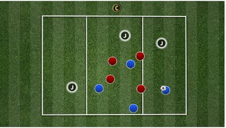 یک مستطیل ۲۰ در ۱۵ متری با دو بازیکن خنثی (جوکر) که از تیم صاحب توپ حمایت میکنند، ایجاد کنید. سه مهاجم تلاش میکنند توپ را در مقابل سه مدافع نگه دارند.