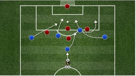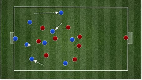 این تمرین بر چگونگی تشکیل ساختارهای موقت توسط تیمهای رابطهای بسته به محل توپ تمرکز دارد – بدون اینکه به آنها دستور داده شود که در یک شکل ثابت بازی کنند.