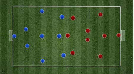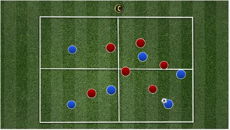 یک شبکه ۳۰ در ۲۵ متری را به سه لاین عمودی تقسیم کنید. چهار مهاجم در مقابل چهار مدافع بازی میکنند و سه بازیکن شناور از تیم صاحب توپ حمایت میکنند.