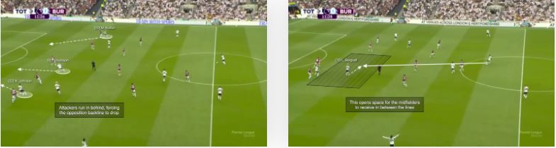با پایین آمدن خط دفاعی، فضای جلوی آن باز میشود. مهاجمان داخلی با زمان بیشتری در بین خطوط، شروع به دریافت توپ میکنند و به جای اینکه فوراً تحت فشار قرار گیرند، رو به جلو هستند. اگر فضای پشت خط قابل دسترسی شود، باید قاطعانه به آن حمله شود. اما حتی وقتی اینطور نیست، همین تهدید به تنهایی شکل بلوک را تغییر میدهد و شرایط را برای بازی ترکیبی بین خطوط بهبود میبخشد.