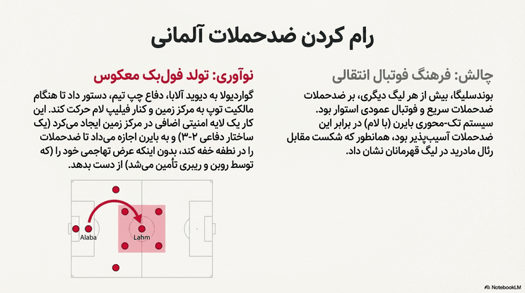 1. مدافعان کناری معکوس (Inverted Fullbacks): دیوید آلابا و فیلیپ لام به داخل زمین متمایل می‌شدند تا از هافبک دفاعی حمایت کنند و از ضدحملات سریع لیگ آلمان جلوگیری کنند.